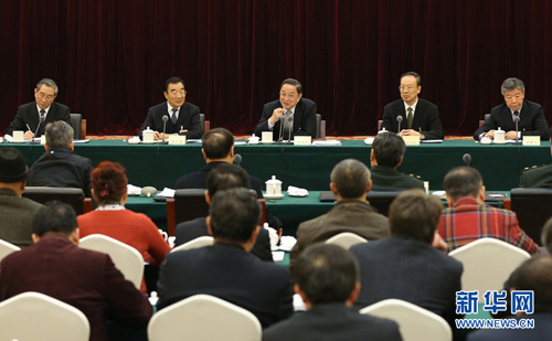 3月6日,中共中央政治局常委、全国政协主席俞正声参加全国政协十二届三次会议文艺界政协委员联组讨论。 新华社记者马占成摄