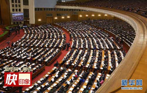 3月10日,全国政协十二届三次会议在北京人民大会堂举行第三次全体会议。这是记者在会场采访拍摄。 新华社记者 陈晔华 摄