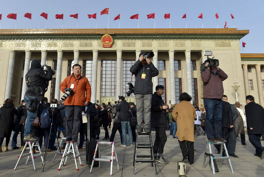两会在北京人民大会堂开幕,记者在会场内外忙碌着。