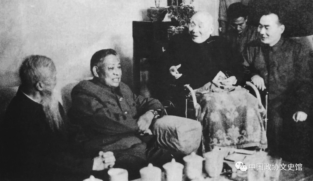 ▲1979年9月14日,因提出新人口理论受到批评的无党派民主人士马寅初(右三),在中共中央关怀下彻底平反。图为北京大学党委领导看望马寅初。