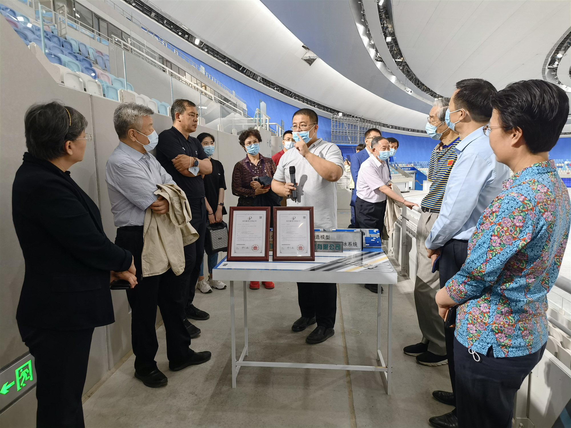 在馆内光洁如镜的白色跑道旁,负责人向视察团介绍了一项新的环保制冰技术: