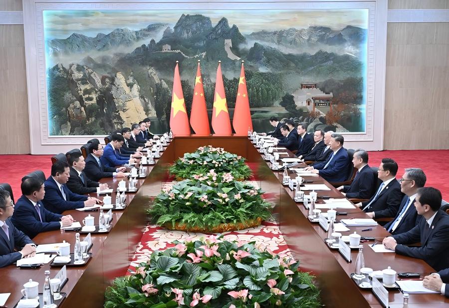 8月31日下午,国家主席习近平在天津迎宾馆会见来华出席2025年上海合作组织峰会的越南总理范明政。新华社记者 燕雁 摄