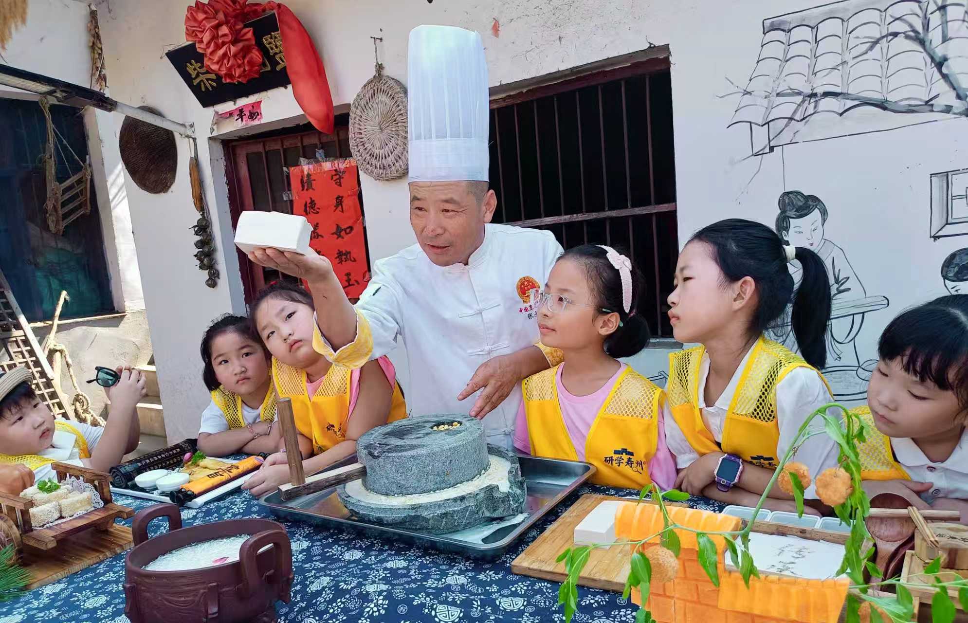 入秋时节,一场“非遗﹢研学”活动在张士宏的非遗工作室展开。参加研学的孩子们体验着豆腐制作工序,并围在张士宏的身旁看他运刀如飞。