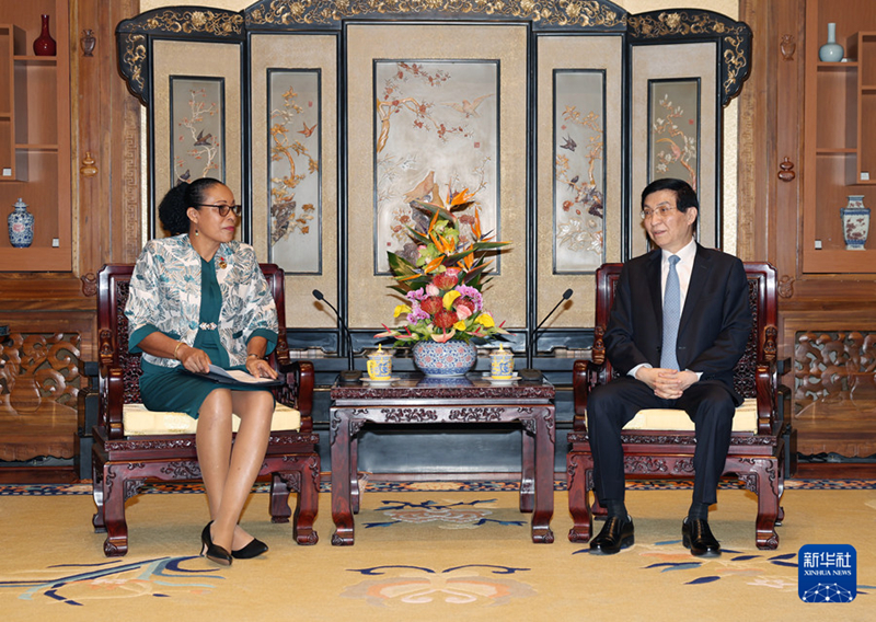 10月14日,全国政协主席王沪宁在北京会见来华出席全球妇女峰会的多米尼克总统伯顿。新华社记者 姚大伟 摄