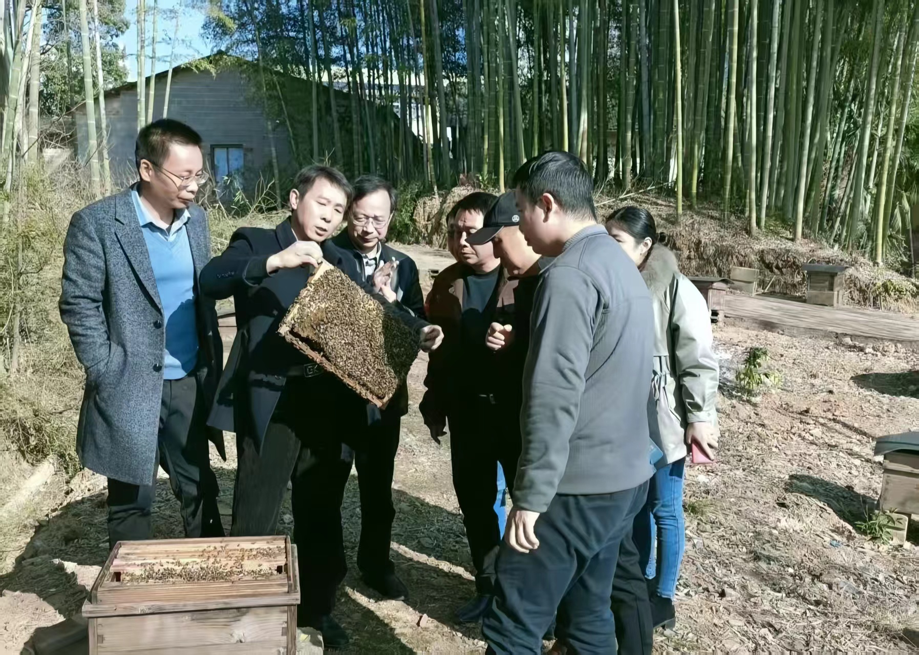 2021年,袁风格(左二)在湖南省浏阳市道然湖养蜂基地现场检查种蜂越冬情况。(图片由受访者提供)