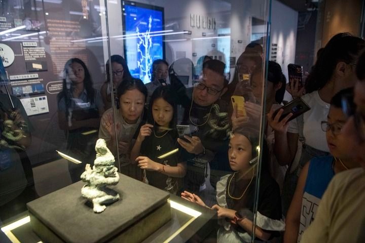 在三星堆博物馆文物保护与修复馆,游客在“匠心妙手——三星堆遗址新出土文物保护修复成果展示”试开放期参观(2024年7月22日摄)。新华社记者 唐文豪 摄