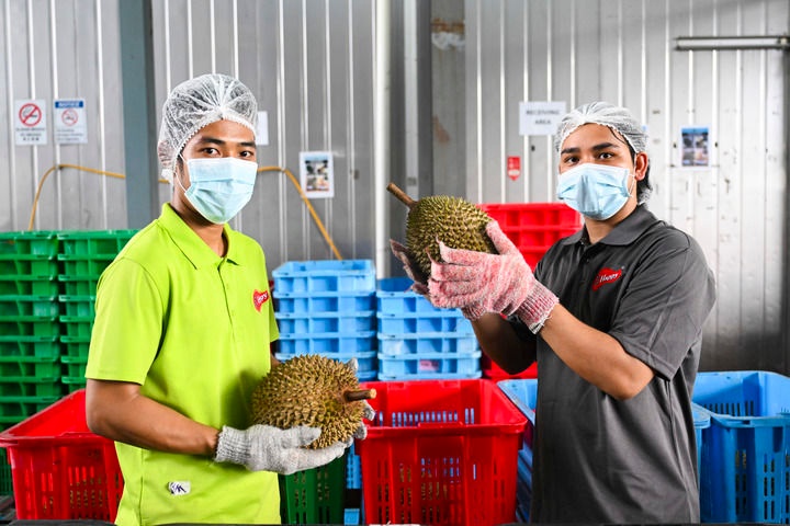 工作人员在马来西亚雪兰莪州的一家榴莲加工厂检查榴莲(2025年10月16日摄)。马来西亚的榴莲从果园采摘到送到中国消费者手中,全程最快仅需36小时。新华社记者 程一恒 摄