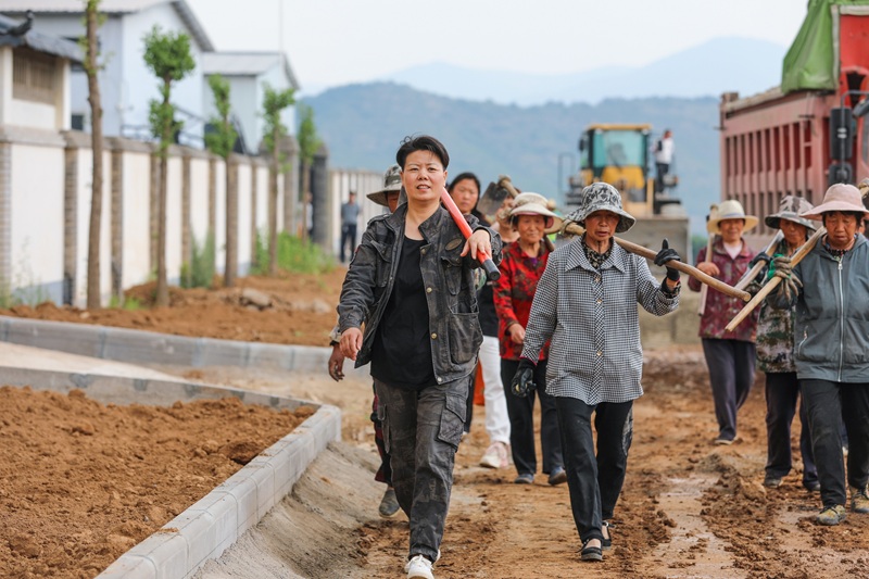 程玉珍(左一)带领村民修产业路、整理绿化带、种植花草。(图片由受访者提供)