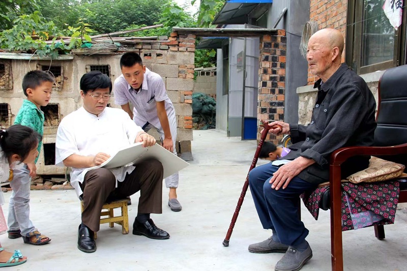 孔维克(左三)为创作《抗战老兵》,在农村考察写生。(图片由受访者提供)