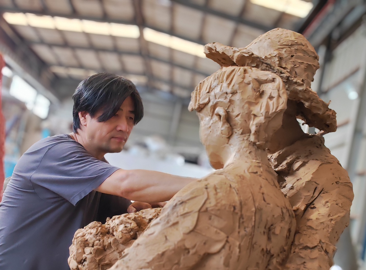二〇二一年,李小超在创作乡村振兴雕塑作品。(图片由受访者提供)