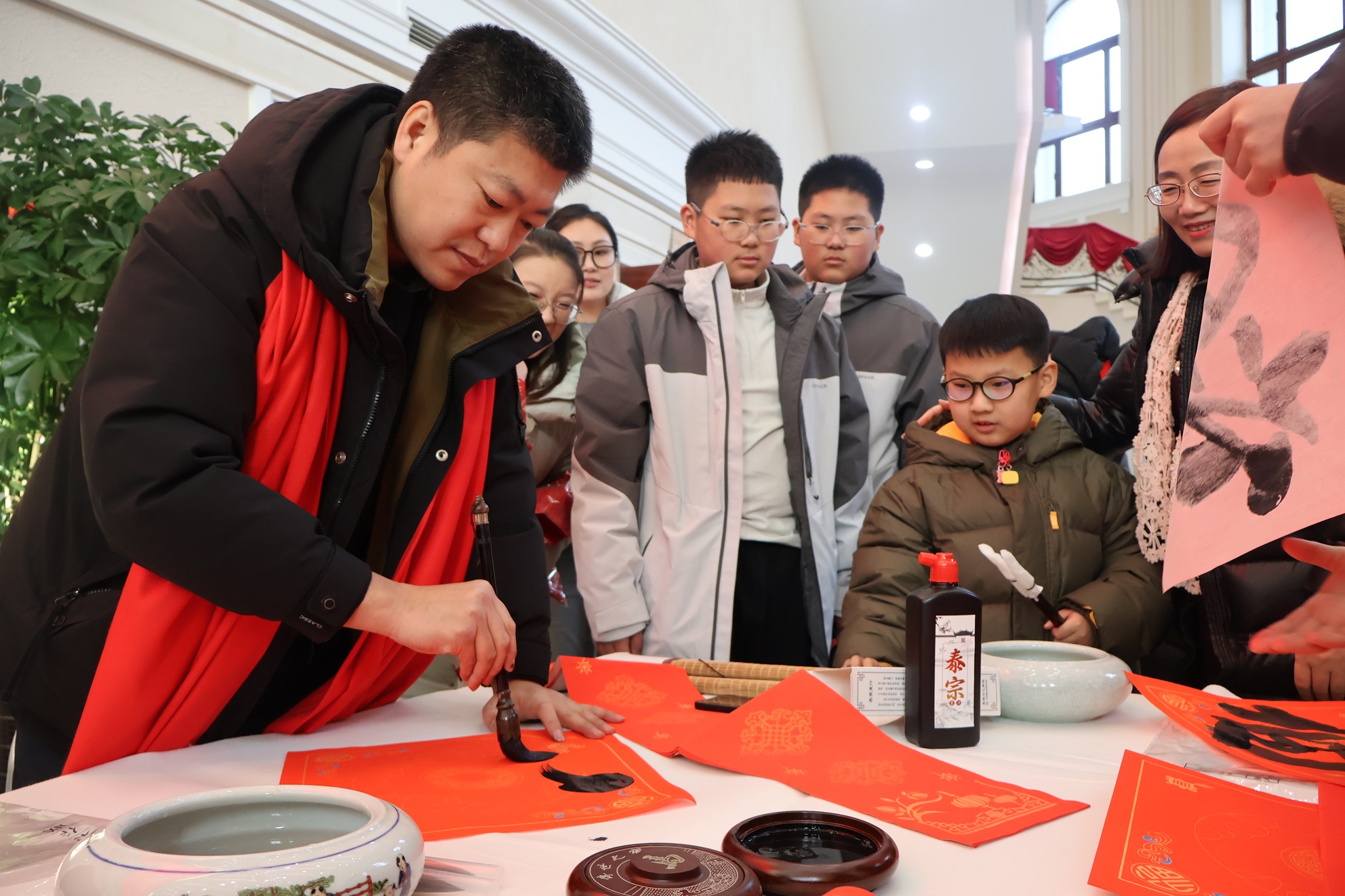 活动现场,来自民进省委会开明画院的书法家们铺纸研墨,即席挥毫,为观众书写飘散着墨香的一副副春联和一张张“福”字,用实际行动为新春文化建设增添喜庆。