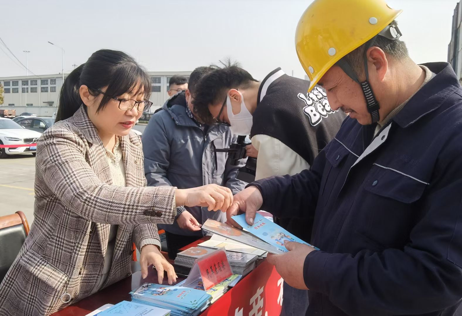 蔡晶(左一)在泰州国际集装箱码头有限公司广场上开展“送健康和政策到企业”活动。(图片由受访者提供)