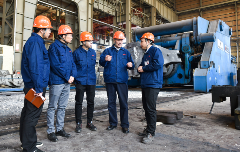 魏世忠(右二)在中信重工机械股份有限公司和工程师讨论技术方案。