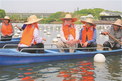 2025年4月11日,闵庆文(右二)陪同国际专家考察浙江德清淡水珍珠复合养殖系统。