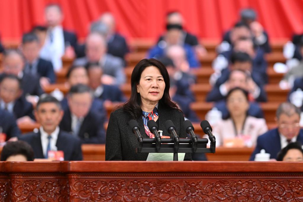 3月7日,全国政协十四届四次会议在北京人民大会堂举行第二次全体会议。这是霍金花委员代表民盟中央作题为《夯实底层技术 加快建设制造强国》的发言。 新华社记者 刘卫兵 摄