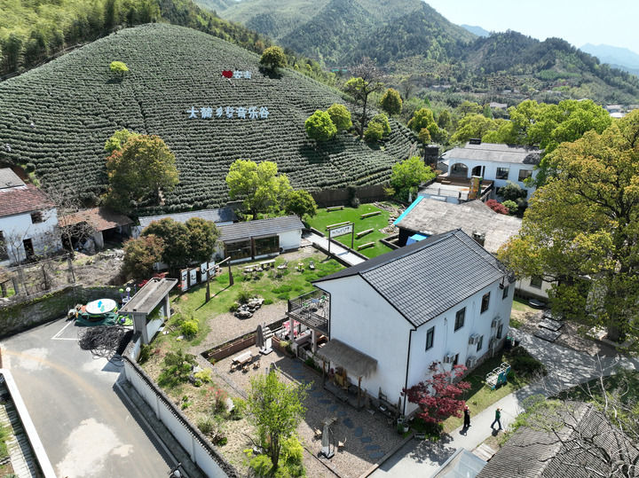 在浙江省安吉县上墅乡上墅村,茶山和一个乡村文旅项目结合在一起(2024年4月9日摄,无人机照片)。新华社记者 翁忻旸 摄