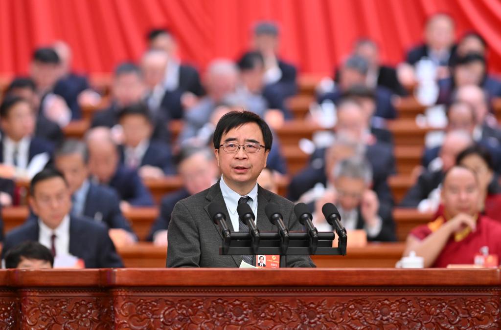 3月8日,全国政协十四届四次会议在北京人民大会堂举行第三次全体会议。这是潘建伟委员代表九三学社中央作题为《弘扬科学精神 培育创新文化》的发言。 新华社记者 张领 摄
