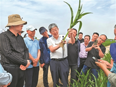宁夏玉米拔节期,李少昆研究员向农户和农技人员介绍防倒伏关键技术。