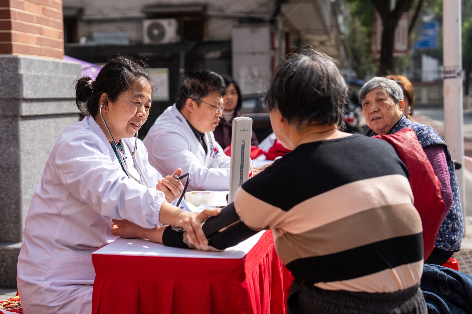 2026年3月5日,在湖南长沙市望城区高塘岭街道雷锋路社区雷锋驿站,志愿者(左一)为市民测量血压。新华社记者 陈思汗 摄