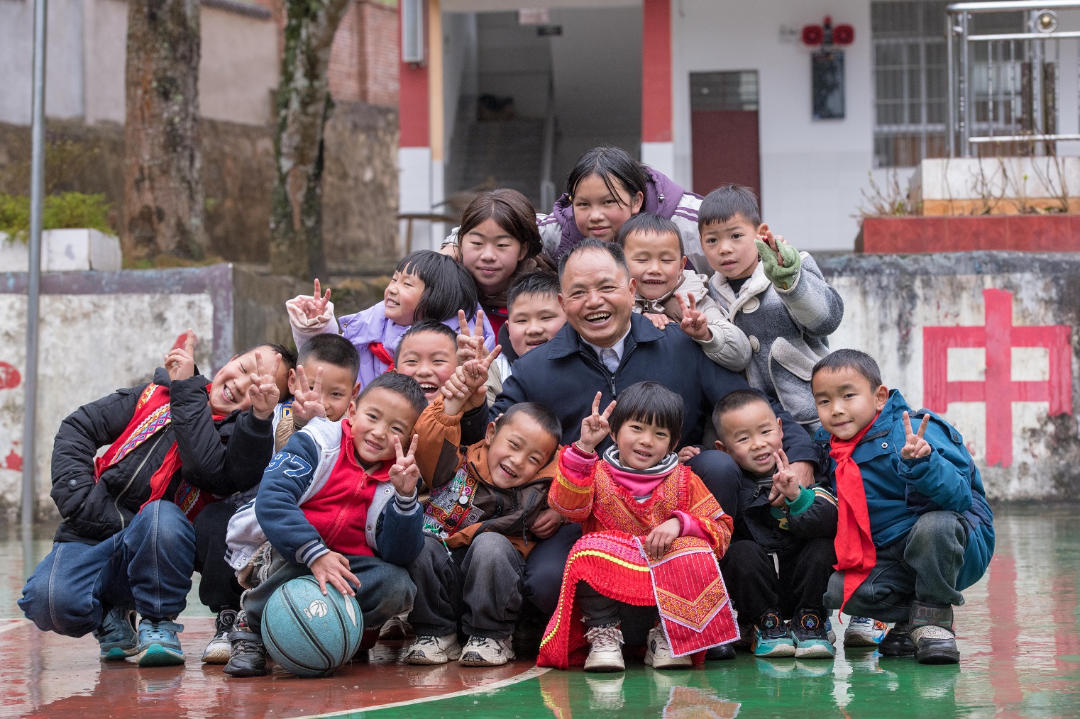 2025年2月18日,在云南文山壮族苗族自治州广南县,农加贵和学生们在落松地小学操场上合影。新华社发(彭奕凯摄)