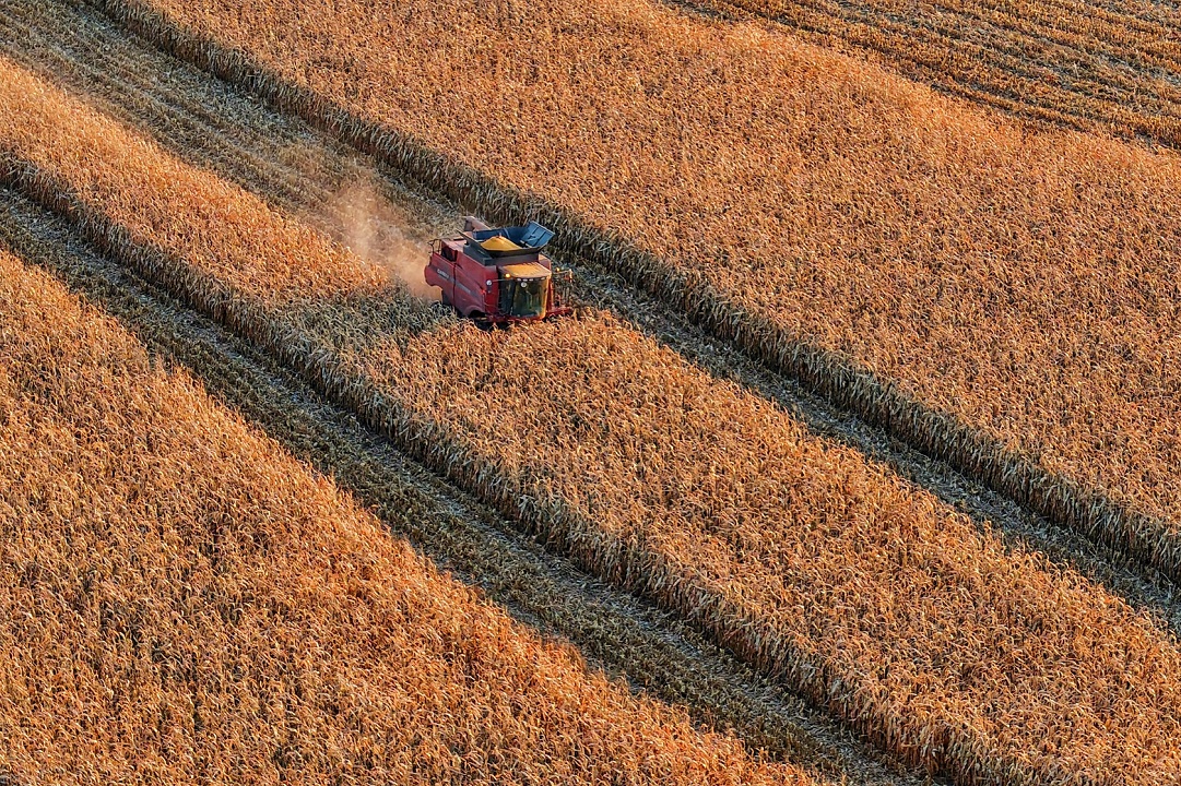 2025年10月14日,在黑龙江同江市街津口赫哲族乡,农户在收获玉米(无人机照片)。新华社发(刘万平摄)