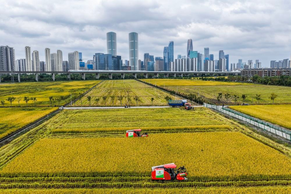 2025年10月21日,在浙江杭州萧山区,收割机在稻田里收割水稻,远处高铁列车飞驰而过(无人机照片)。新华社记者 徐昱 摄