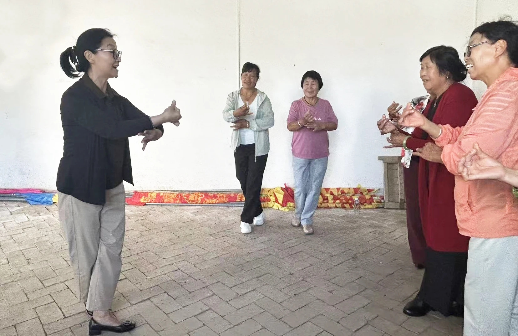 柳萍(左一)参加“送文化进乡村”活动,为秦腔爱好者做现场培训。 (图片由受访者提供)