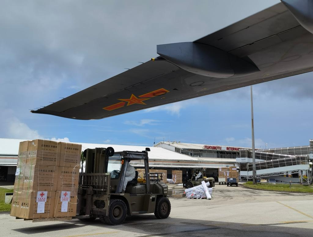 工作人员在汤加首都努库阿洛法机场卸载中国运-20飞机运送来的援助物资(2022年1月28日摄,手机照片)。新华社记者 丁增义 摄