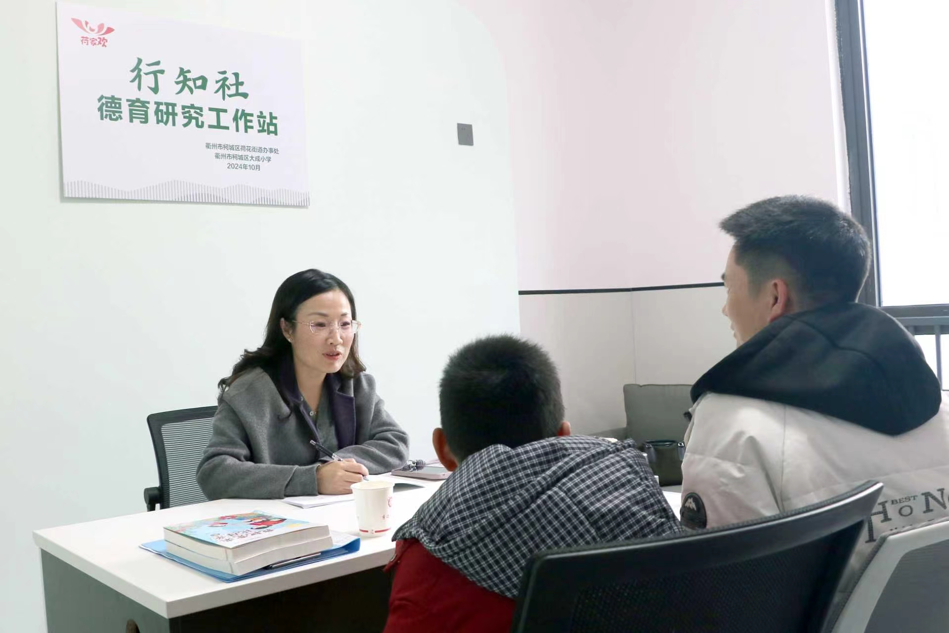 许建芳(左一)在“行知社”德育研究工作站为家长学生提供一对一咨询。 (图片由受访者提供)