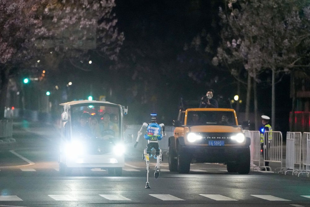 2026年4月11日晚,一台机器人在测试活动中奔跑。4月11日晚至4月12日凌晨,2026北京亦庄人形机器人半程马拉松全流程全要素测试活动在北京经开区举行。新华社记者 鞠焕宗 摄