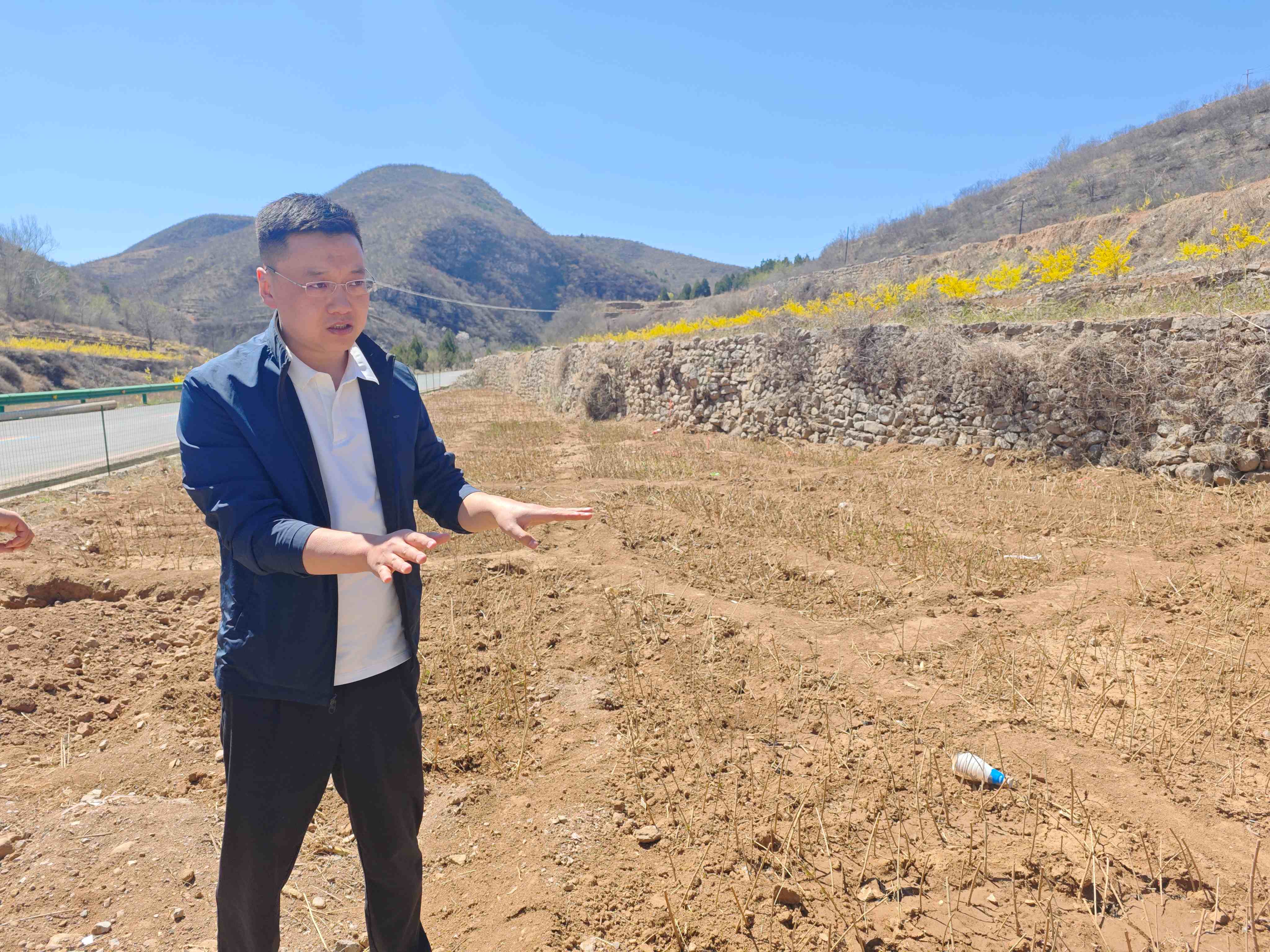 翟永峰在洪水村连翘种植基地向来访者讲解连翘苗成长情况。 (图片由受访者提供)