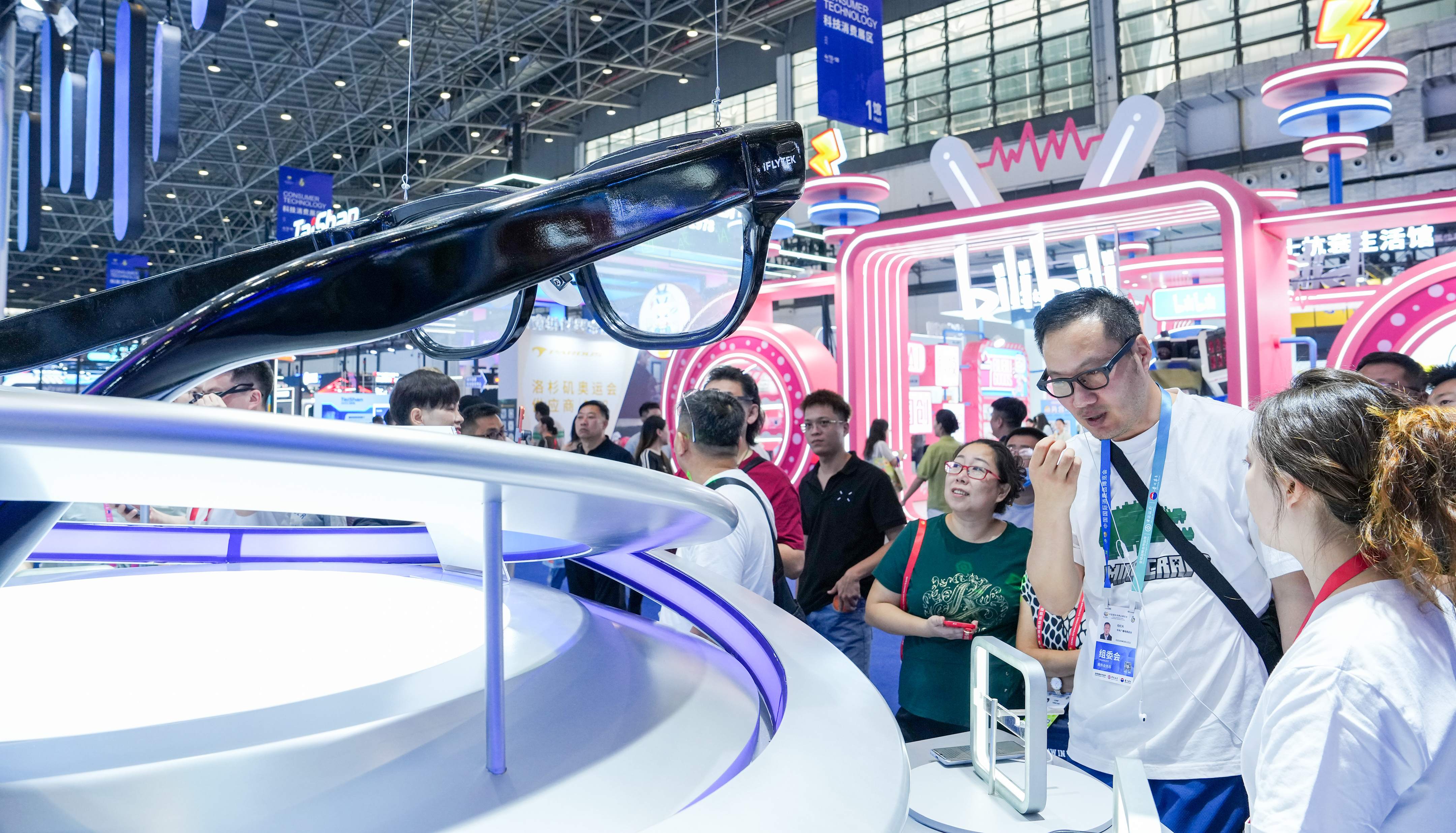 4月14日,观众在第六届消博会科技消费展区了解科大讯飞的AI眼镜产品。新华社记者 杨冠宇 摄