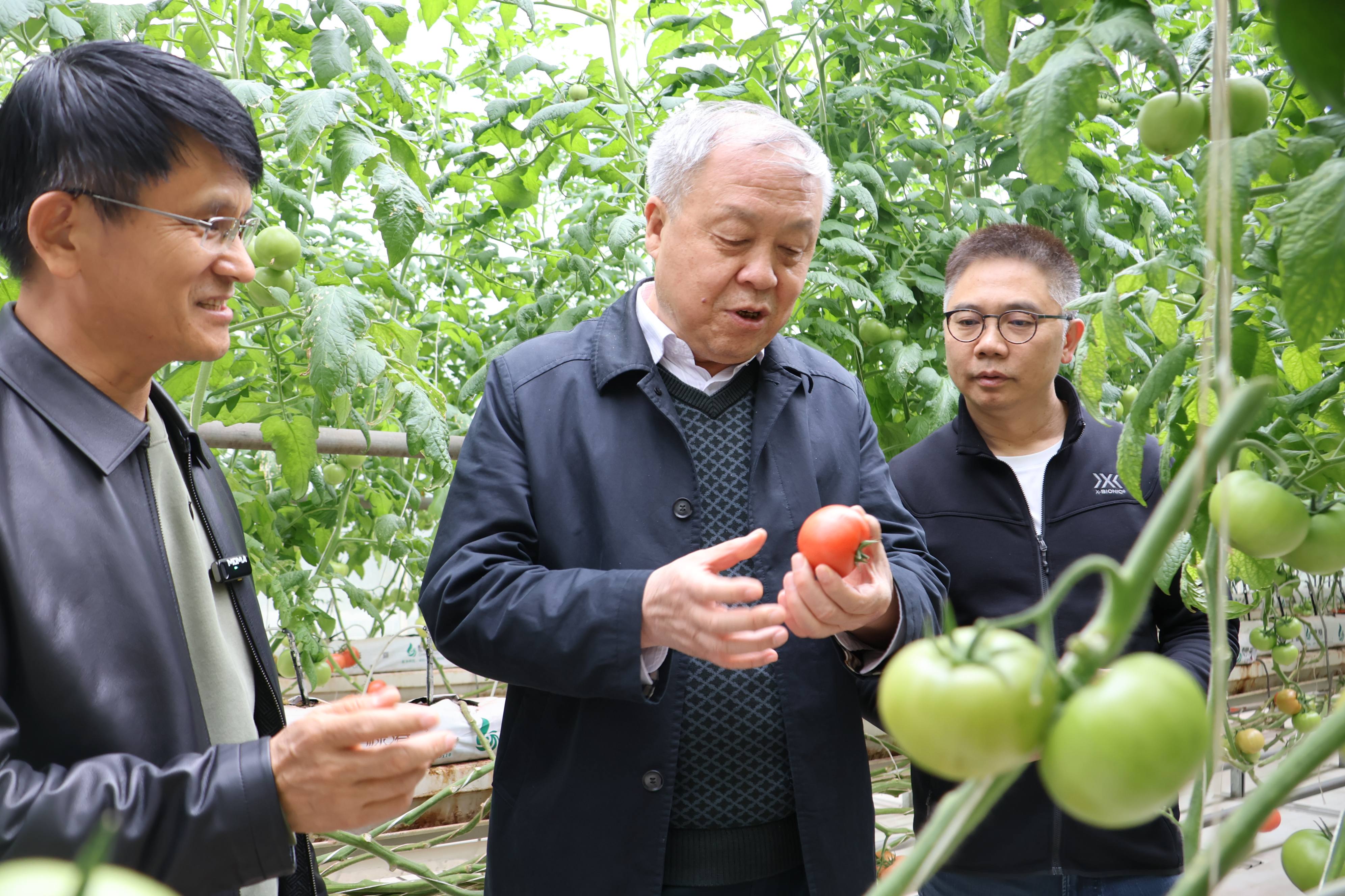 活动期间,全国政协委员李宝聚(左)、侯水生(中)、戚益军(右)在山东省临沂市兰陵县一农业生产合作社查看西红柿生长情况。